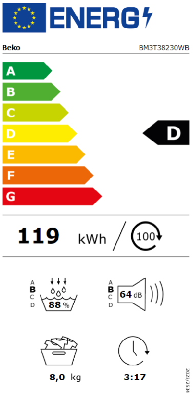 Aecadora Beko BM3T38230WB8 kg, 15 Programas, Clase D, Display, Blanco