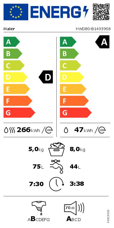 Lavasecadora Haier HWD80B14939S8-IBClase D, Lava 8kg, Seca 5kg, 1400r, Vapor, 15 Programas, Inox