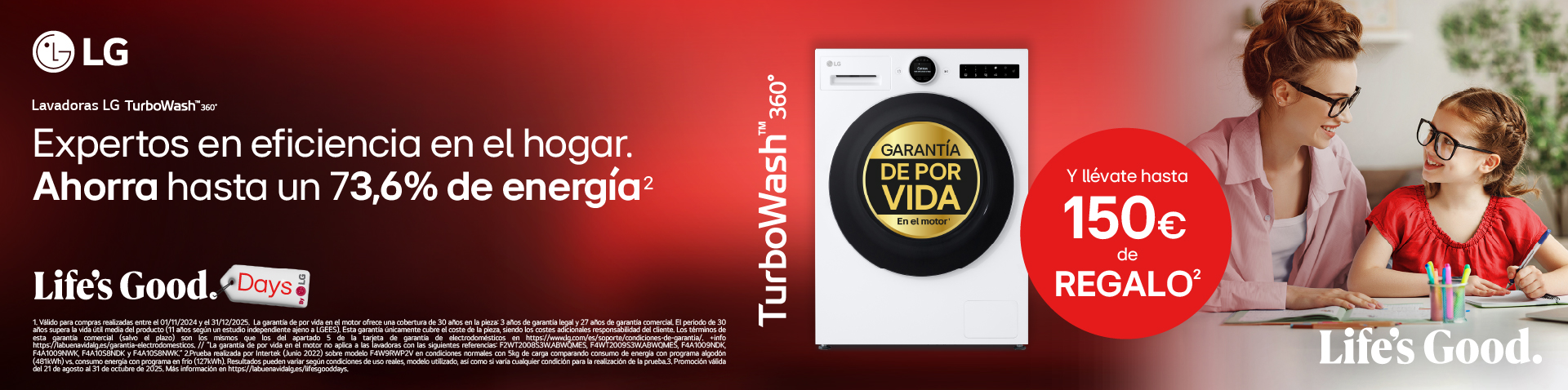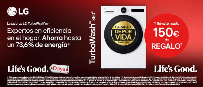 Del 21 agosto al 31 de octubre compra una lavadora LG y llévate hasta 150€ de regalo. Canjea tu regalo en el siguiente enlace.