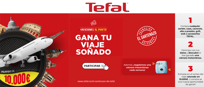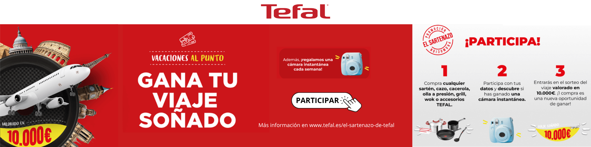 Compra cualquier sartén, cazo, cacerola, olla a presión, grill o accesorios Tefal participa y te podrás llevar un viaje valorado en 10.000€. Registra tu compra en el siguiente enlace.