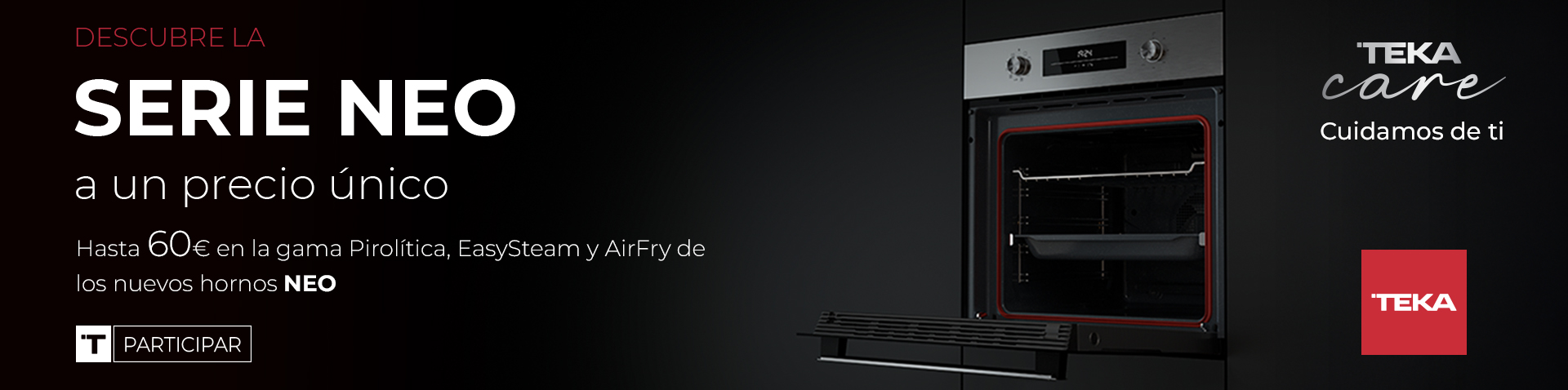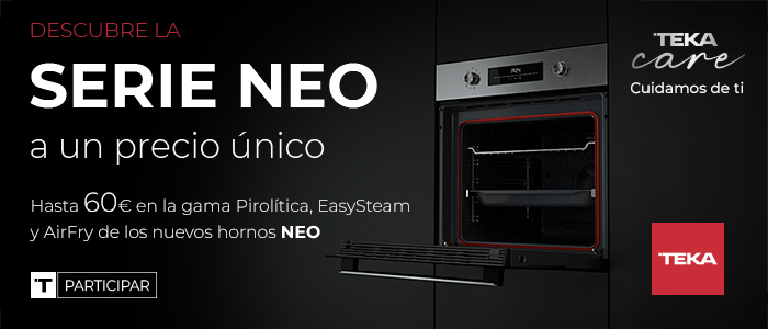 Lanzamiento de la nueva promoción de Cashback Teka Care, aplicable a la serie Neo y a los nuevos frigoríficos Combi. Llévate hasta 60€ en hornos Teka y 200€ en frigoríficos Teka. Promoción válida hasta el 30 de septiembre de 2025. Formulario de esta promoción en este enlace.